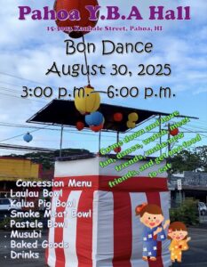 The Pahoa Nikkei Jin Kai will be hosting a Bon Dance at the Pahoa YBA Hall. The last bon dance in Pahoa was held prior to Covid on August 24, 2019.Drumming will be done by Puna Taiko and the dance will be led by Shinka Odorikai.