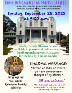 Please join us for our weekly Sunday Family Dharma Service. The service is available in person or online via Zoom. Rev. Satoshi Ka’imipono Tomioka will share the Dharma Message “Before we think of others, we have already been thought of by others”.