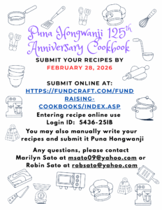 The Puna Hongwanji Sr. YBA is taking the lead to gather and put together a 125th Anniversary Cookbook for Puna Hongwanji. The goal is to collect 500 recipes from our members, families, and friends. Please help us reach this goal. We are targeting to collect all these recipes by February 28, 2026. We have not determined a price of the cookbook yet as we are first trying to collect 500 recipes. Please share your recipes for the future generations.
